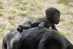 This baby gorilla clings to her mother's back for safety. What continent do gorillas come from? |