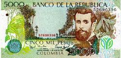 In Colombia, I collected a bill that featured the poet Jose Asuncion Silva. The note is worth 5000 of what unit of currency? |