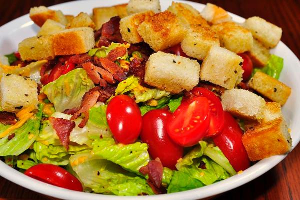 7. I filled my plate generously with the salad my grandparents brought along. As well as the vegetables, it featured two ingredients commonly added to salads for flavor and texture. What non-vegetable ingredients can be clearly seen in this image?