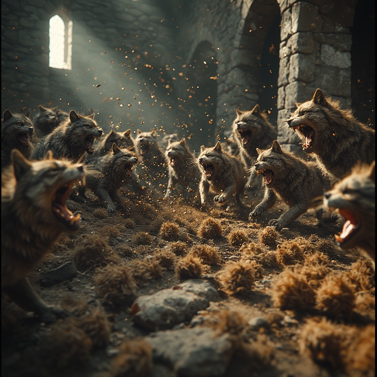 | | What's that devilry? Once one of them is sufficiently damaged, they explode into small furball grenades... and this is sending the wolves into a rage... they are tearing into the Frankencats everywhere. I wonder if anything will be left after this! | |