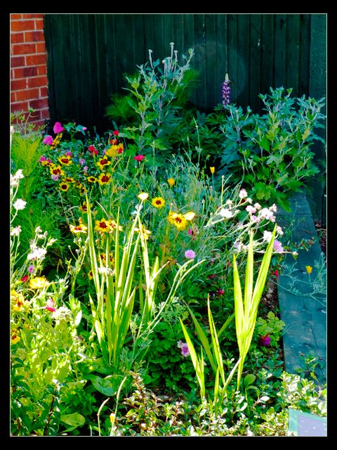 When I was deciding on how to plant my front garden after it had been landscaped, I had three main parts to consider - the purpose-built flower bed, the two areas of gravel, and the largest area of all, the mulched slope that goes down to the road. Some of it slopes quite steeply so I was concerned that the mulch would simply slide downhill, particularly when it rained - which in this country it does quite a lot. So I put some shrubs in the steepest area and just below them I tipped some topsoil on top of the mulch. It's only a strip, about half an inch deep and a foot wide, but I figured that if my plan didn't work that would be easy enough to lose in the mulch with a bit of raking. Anyway, onto that topsoil I sprinkled some wildflower seeds... and this is what I got: