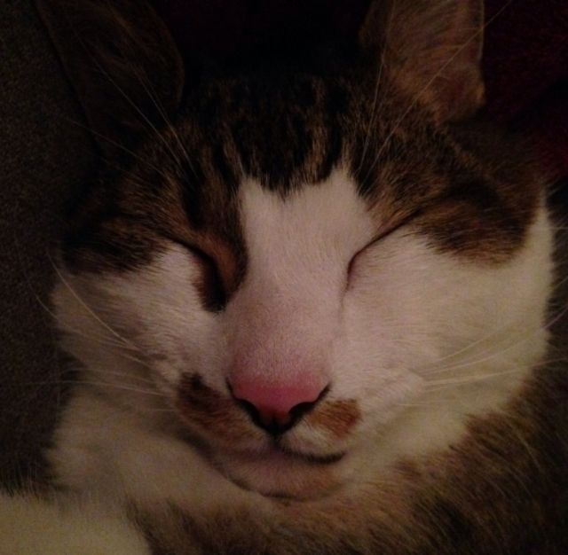 Princess is reasserting her dominance in the household. That piece of newspaper she is lying on has been Quentin's hangout for two months. He had it in the hotel & I brought it to the apartment. Newer pages of newspaper haven't tempted him.