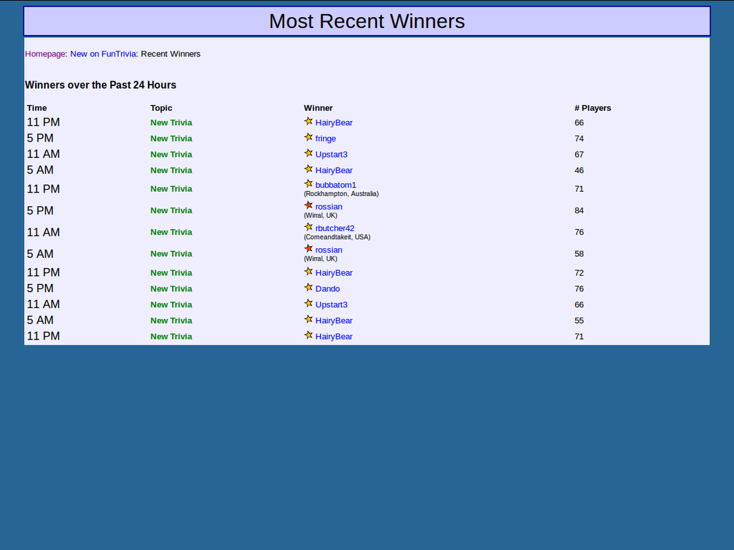 This forum is for feedback about general FunTrivia features and games, or bugs that affect a large number of people.