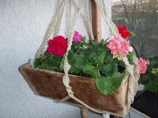 He wasn't there and I couldn't see him when I said where are you? He yelled on the balcony and so off I flew thinking something bad had happened to one of our kitties. Well I got there and all over the floor was the hanging basket with the dirt and flowers all over the floor. Seems the hook let loose from the ceiling and crashed to the floor. He was so upset, so there I was on my hands and knees at 4 am scooping up plants and dirt and hopefully wishing the plants would be ok.