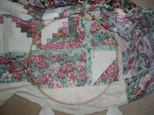 A work in progress. Since taking this photo I've finally finished and given it to the person intended. It is in the hoop as I hand quilted it. If I can get it back on loan, I'll show the finished product. The bit of floral you can just see at the top is the backing and will match the area where she is placing it. In detail