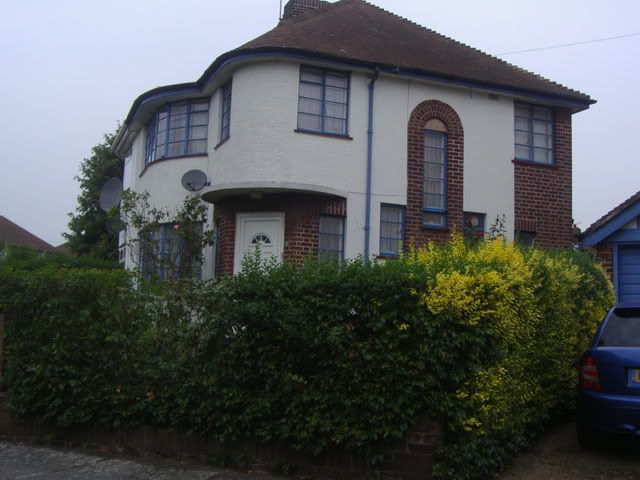 (the almost smoothed his eyebrows cracked me up) David, A good friend of mine lives in a house very similar to that one, but his has very dark red trim/gutterwork as opposed to the blue. The curved sides and large arch over the window are almost identical. If I remember, I'll take a photo of it the next time I'm there. I agree, get yourself another cat.