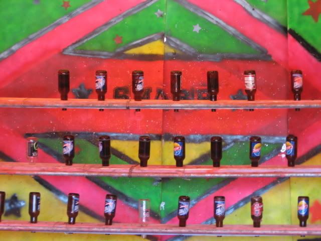 Upside down beer bottles, set up in such away that they're almost impossible to knock down with a thrown ball...I know, I hit one of them more than once at the fair this afternoon, and it didn't budge!