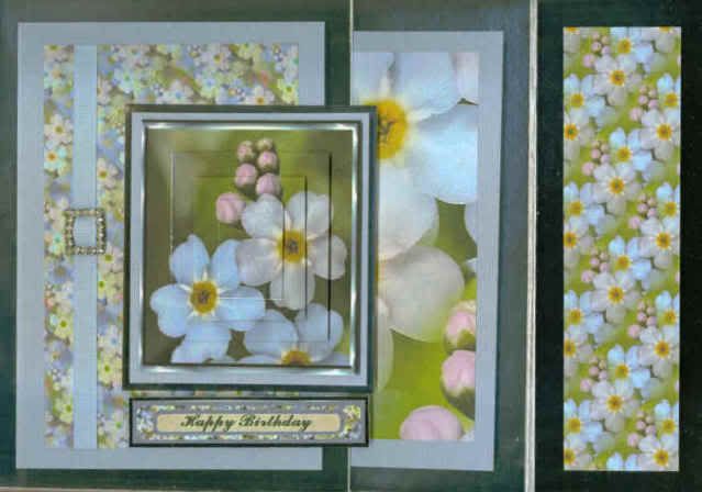 This is a joint effort between Mada and I. She designed the papers and 'topper' on the front and I used her design to produce the paper which is inside. It is a large card.  I scanned the inside with it open on one side, the on the other side and finally took a photo of it fully open but the colour is all wrong in that, but you get the idea of what is like open. The border is shiny silver, not black or gold!