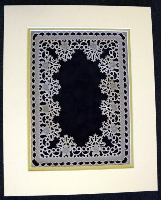 Those are fantastic, very clever. I have just returned from a week on a residential parchment crafting course. We had a major project to complete during the week and also some Christmas cards to break up the work, some of which took minutes and some took hours. I have to finish off a couple of the cards then will show those to you, but in the meantime this is the project. The parchment is A4 so it is quite large. We did an oval watercolour piece to fit in the centre but I wasn't happy with mine and also it is a poinsettia and holly so very seasonal; I would prefer to place something which would enable me to have it on display all year so will give it some thought. The dark background is 'velvet' paper in navy blue, we could choose from a range of colours. I have absolutely no idea of the number of holes pricked into this piece but it is in the thousands, many thousands. The white border between the scallops and the lace has been pricked.