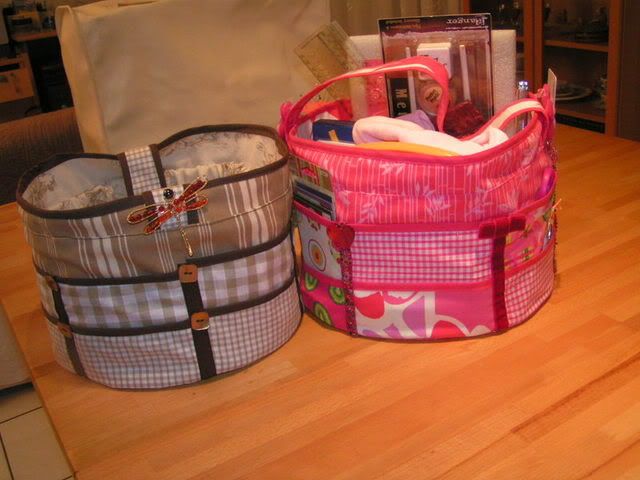 Those coasters look first class, Copago. I love the fun style of the images you used. Are they rubber-stamped andpainted, or something else? Sue, that parchment is amazing! I can't even begin to imagine how much work you put into it!!! Great stuff indeed! I spent the weekend sewing. Craft stuff just refuses to be contained, has anyone ever noticed? I refuse to yield! It will live in that tote!!! I made a tote for myself a while back, and this weekend made one each for two friends. (Their choice of fabric!) The flashy pink one is mine.