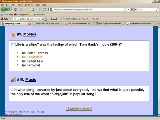 Terry, I have just played the game in its last 40 minutes (at approx. 7:20AM), I was appointed Set #9 and I noticed a glitch on Question #10 - there were no options to pick from. Not even a FITB 'thing' to use  . I did a print-screen which you can see in HERE. Hope it helps... I doubt it was my computer or my browser. Everything else on FT (and everywhere) was working more than fine. I was wondering if it has something to do with the use of "[...]" - square brackets - in the question's text. I am also curious if other players of Set #9 encountered the same thing.