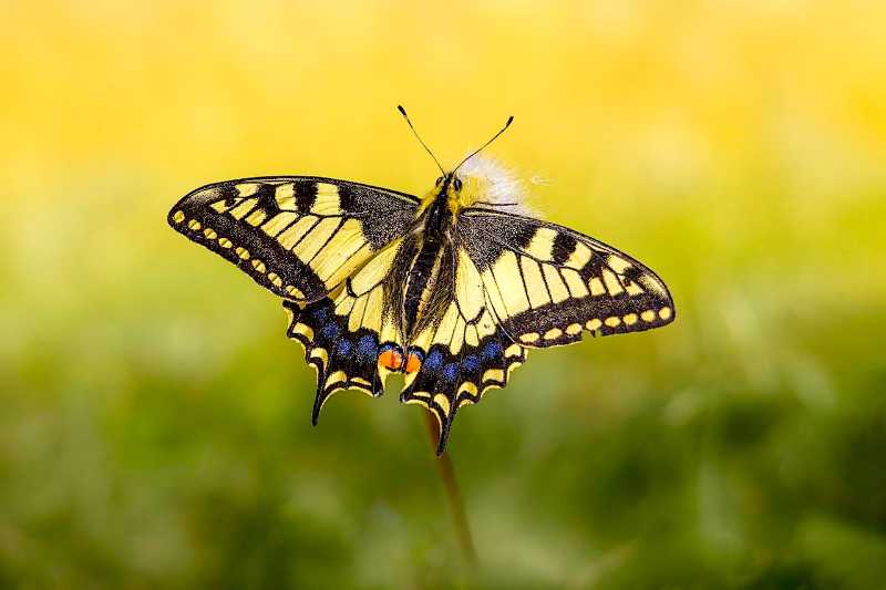 The name of this delicate butterfly is the swallowtail and the name reflects the "forked" tails of its wings. Whilst the majority of the insect is coloured yellow and black, there is a deviation from this pattern by way of a little splash of blue and red featuring just above the insect's signature tapering tails.