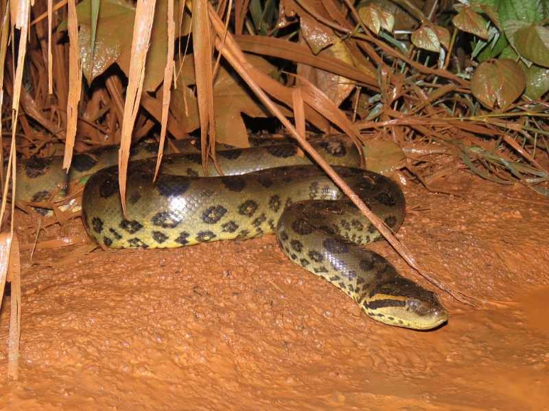 Green anacondas are mostly active at night and prefer to be alone. Females are much bigger than males, and they give birth to live babies, up to 40 at a time! They rarely attack humans and normally avoid people when possible.