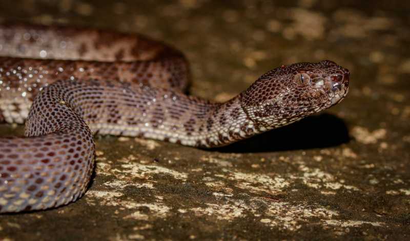 The mangrove viper is a venomous snake which is native to the mangrove forests of Southeast Asia. They can grow to roughly 60-100 cm (2-3 feet) in length. They have an intricate pattern and can vary greatly in colour, from brown, olive, yellow, grey and even blueish. Some have red eyes.