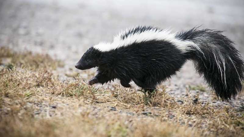 The striped skunk is native to North America and is easily recognized by the two white stripes that run down the centre of its back. The stripes are purely a piece of aposematism... in other words, it's an advertisement to predators that it carries a foul smelling scent that it can secrete from a set of glands that are located near its tail.