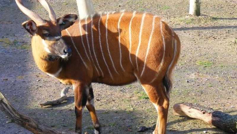 Found in the forests of Central and West Africa, the bongo is a large nocturnal member of the antelope species. It bears a reddish-brown coat splayed with vertical white stripes that imitate sunlight streaming through the trees, making it difficult for predators to spot them.