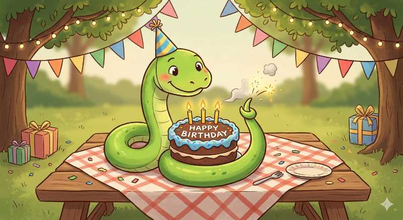 2. A serpent with a frosted, layered dessert. A ____ eating ____.