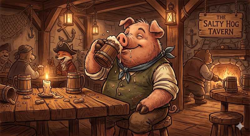 7. A large swine with a cup full of a pirate's rum drink. A ____ drinking some ____.