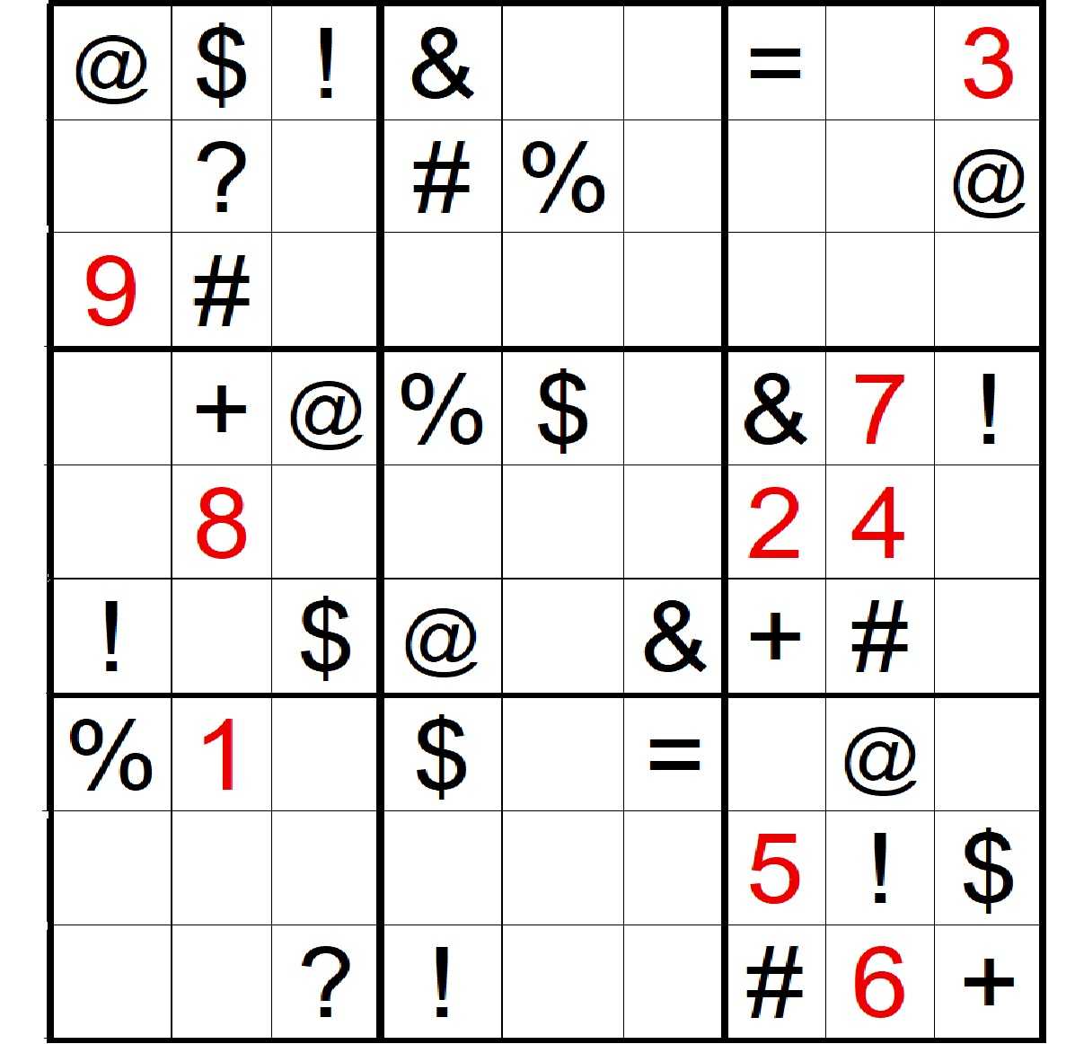 Each of the nine symbols used appears nine times: once in each row, once in each column, and once in each of the nine boxes of nine squares (outlined in bold) that make up the grid. Start by identifying squares that are currently empty or have a number in them where only one symbol can possibly fit, and see how that narrows the possibilities. I have listed the symbols in the order in which I determined them, but there are a number of places where your solution may differ.