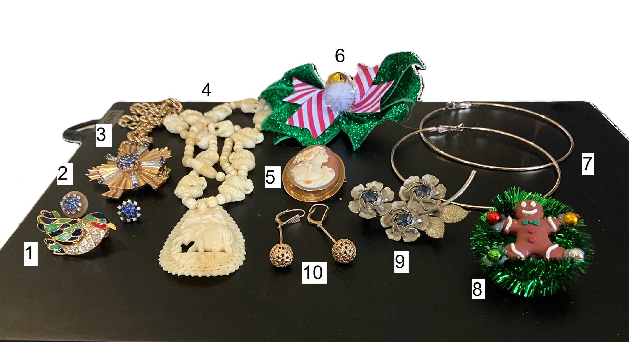 Christmas wreath broochpendant earringsivory cameo broochsilver and sapphire broochsapphire and diamond lavaliersapphire and diamond stud earringshummingbird broochhoop earringsChristmas hair bowivory necklace* Drag / drop or click on the choices above to move them to the answer list. View Image Attributions for This Quiz