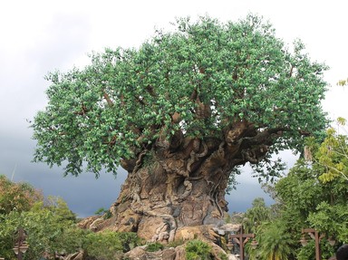 The Tree of Life is the iconic 145-foot (44 m) tall centerpiece of the park. It looks like a real baobab tree but is actually a feat of engineering It was built around a repurposed offshore oil rig to withstand Florida's hurricane-force winds. Its base is 50 feet (15 m) wide and its canopy spans 165 feet (50 m). The tree features over 100,000 artificial, foot-long leaves in five shades of green, each designed to move in the wind for a natural appearance.