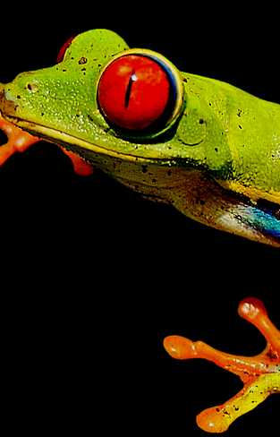 To be more specific, this is the red-eyed tree frog - no prizes for guessing where it got that name. It is found in Central and South America and its bright colouring helps with camouflage in the forests where it lives. You can just see a bit of its webbed feet, which help it to cling to leaves and branches.
