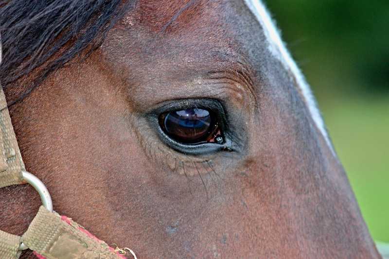 This is an animal you are more likely to see in the countryside, as this eye belongs to a horse. Most horses have been tamed and are used for riding, racing and, for some breeds, working.