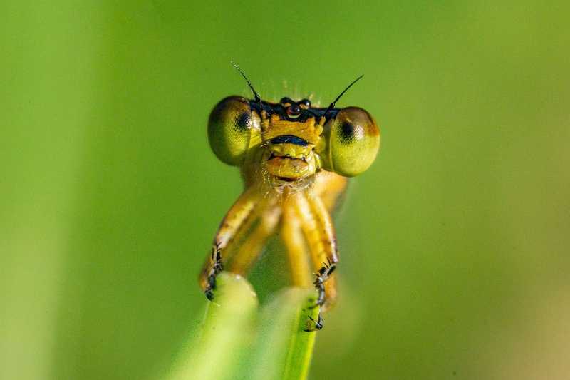 This is an unusual view of a dragonfly, but it does give you a good look at its eyes. It is a type of insect, which you are likely to see hovering over a pond while hunting for insects. The eyes are very large and are called 'compound', meaning that they contain a large number of light collecting cells.