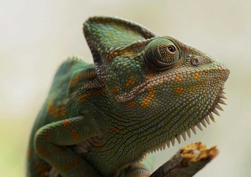 Clicking on the photo will make the chameleon's distinctive eye even clearer. The chameleon is a type of lizard, known for being able to change its colour to blend in with its surroundings. The type of change depends on the species of chameleon, with some being able to change colour completely while others can only vary the brightness of their skin.