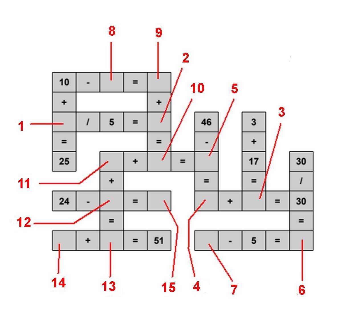 This is a sort of crossword with numbers in simple equations linked by + (plus), - (minus), / (divide) and = (equals) symbols. Work out which number from the selection goes in the spaces marked by red label numbers.
