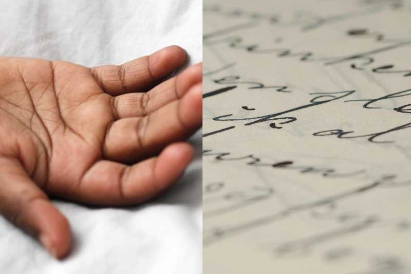 A hand is what you use to hold and move things, and writing is how you make words with letters. Handwriting is the way your letters look when you write by holding something in your hand.