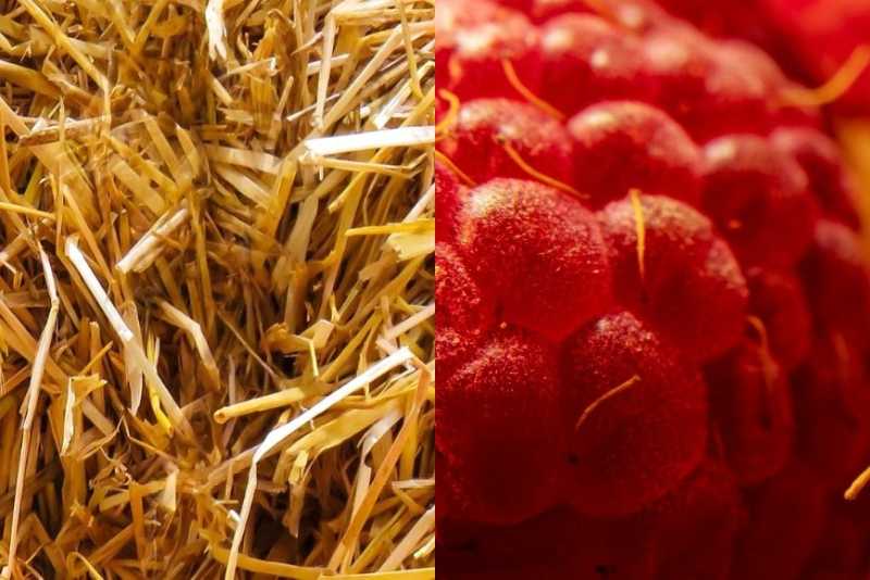 Straw is dried grass or hay that animals can eat or sleep on, and a berry is a small, sweet fruit. A strawberry is a juicy red berry with tiny seeds on the outside.