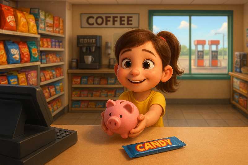 3. This is a little building where people can put fuel in their car and buy treats like slushies, candy, and chips. You'll need to bring your money though if you want to buy things here. What is this place called?