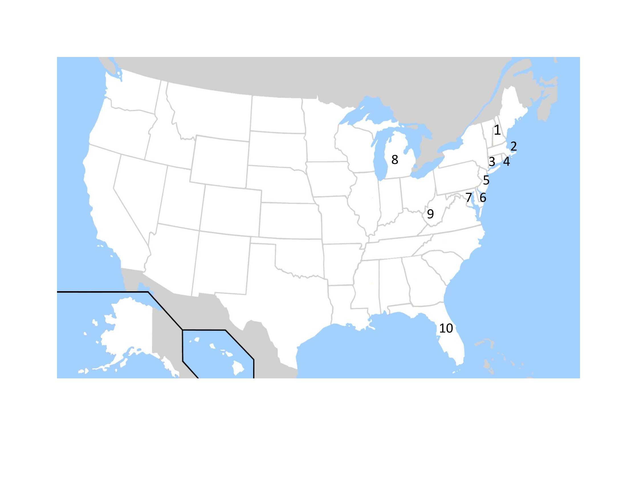 Look at the map and find the numbers. Your task is to decide which U.S. state is represented by each number. But wait! There's a twist! Identify the state using its nickname! Good luck!