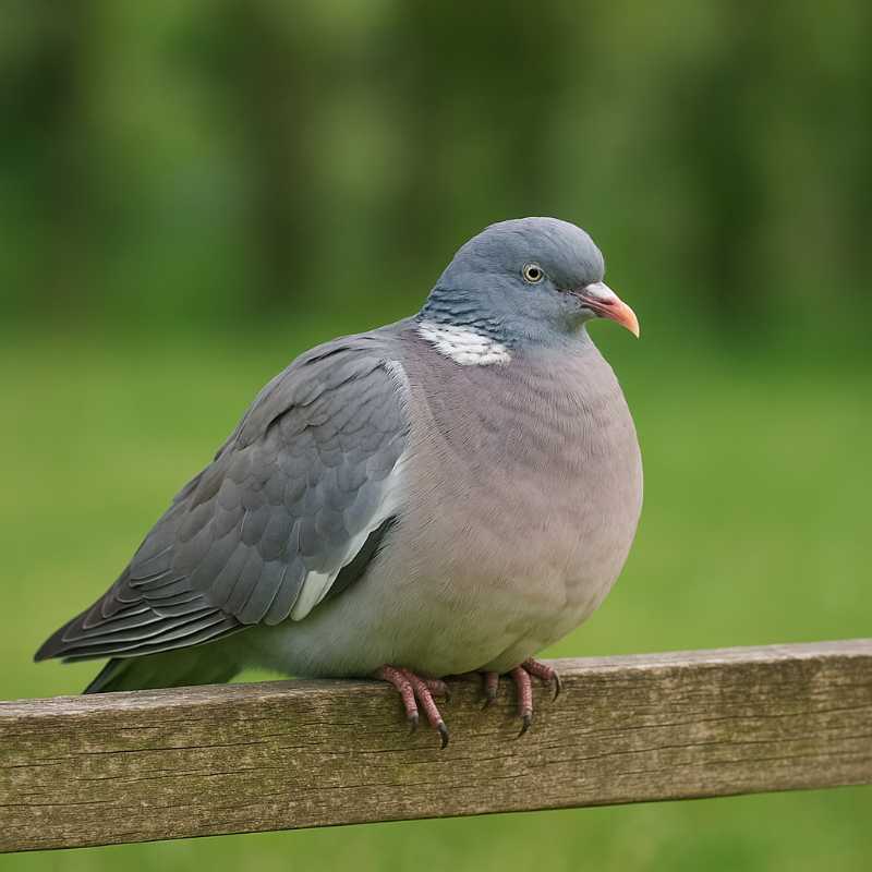 The Common wood pigeon lives across much of Europe, parts of North Africa, and western Asia in woodlands, farms, parks, gardens, and cities. This pigeon is mostly gray with a pinkish-gray breast and a bright white patch on its neck that makes it easy to spot. It eats mostly plants and sometimes small creatures like worms or insects. Wood pigeons build a simple twig nest high in a tree or shrub. The female lays one to three white eggs, and both parents keep the eggs warm and feed the chicks. The eggs hatch after about 16-17 days, and the young stay in the nest for about four weeks before they fly.