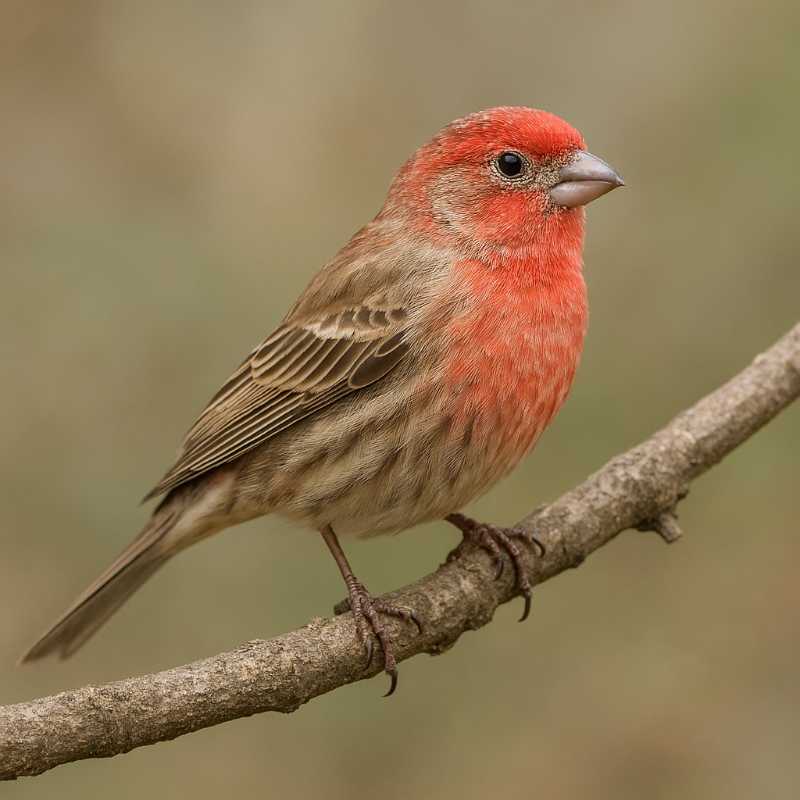 The house finch (Haemorhous mexicanus) is a small songbird native to the western United States and Mexico that lives in open woods, deserts, and neighborhoods. Male house finches often have bright red feathers on their head and chest, while females are brown and streaky, which helps them stay camouflaged.