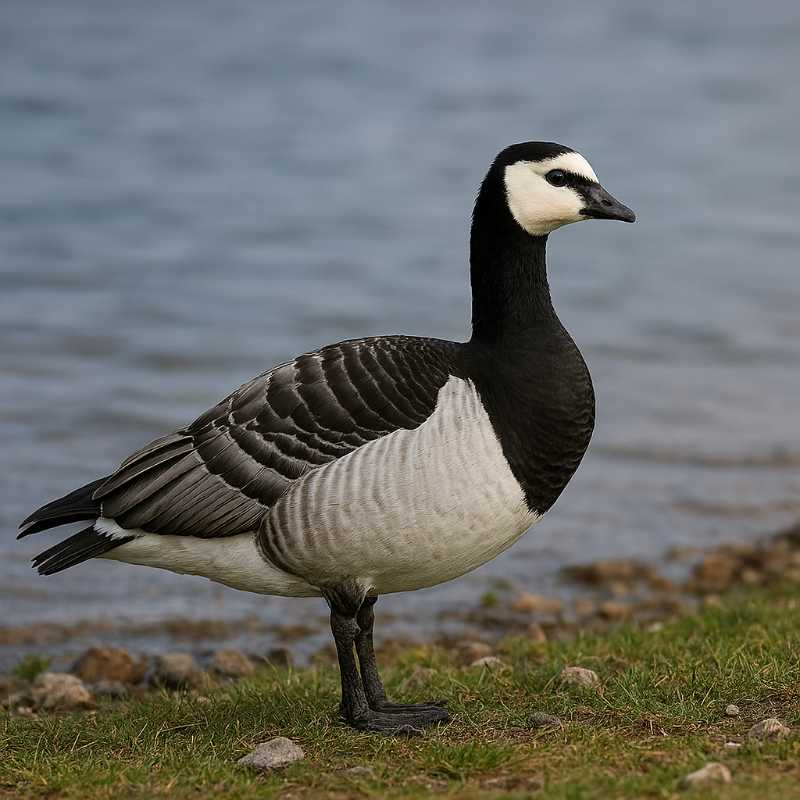 The barnacle goose is a black and white goose that breeds way up in the Arctic on rocky islands and tundra and then flies south to spend the winter in places like the British Isles and the Netherlands. These geese often nest high on cliffs so foxes and polar bears cannot reach them, and when their fluffy babies hatch they cannot fly yet and must jump down from the cliffs to reach the feeding grounds below.