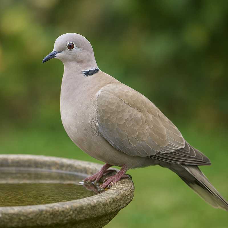 The Eurasian collared dove is a dove that originally lived in parts of Europe and Asia but was later introduced to other places and now lives in many towns, farms, and backyards in North America. It likes places where people live because seeds and grain are easy to find, and it often visits bird feeders or walks on the ground looking for seeds or bits of grain.