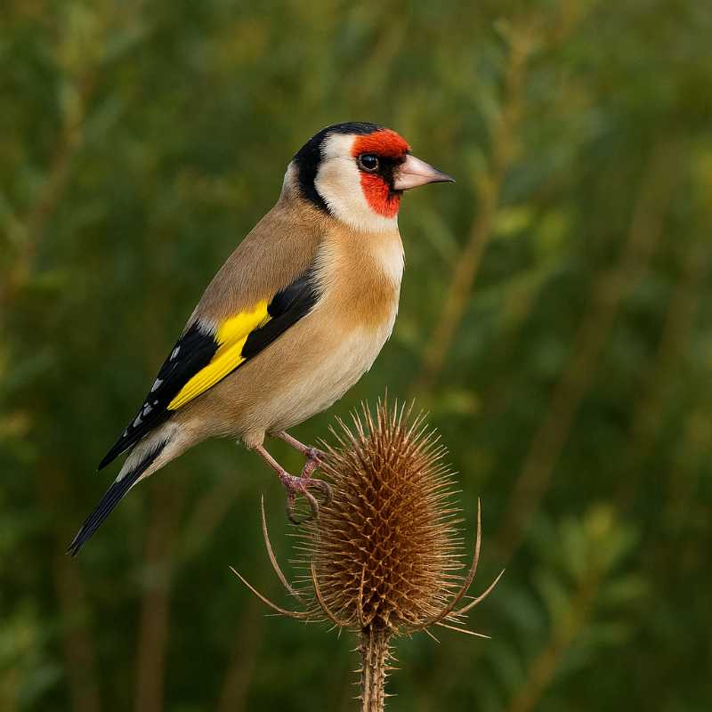 The European goldfinch (Carduelis carduelis) is a small, colorful songbird that lives naturally in Europe, North Africa, and western and central Asia. It likes partly open places with scattered trees or shrubs, such as orchards, gardens, parks, farmlands, hedgerows, and woodland edges.