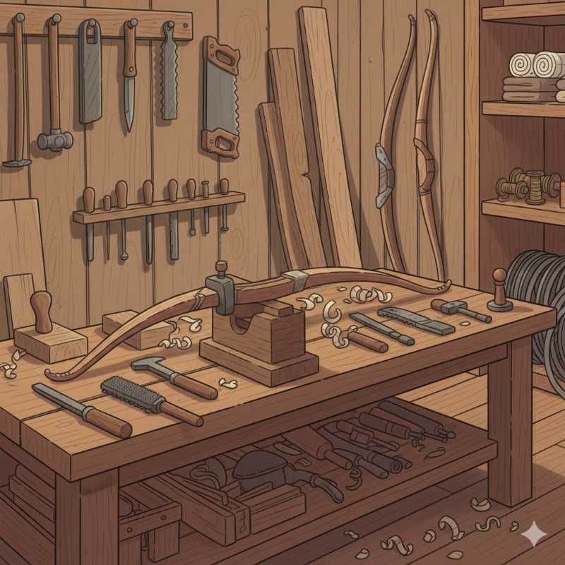 Bowyers, specialists in making bows, used drawknives, planes, tillering sticks, clamps, and staves of yew, ash, or elm to make their bows. They had to shape the wood and remove layers to achieve the correct balance of flexibility and strength. Then they tested the bow's curve with a tillering stick to make sure the tension was even.