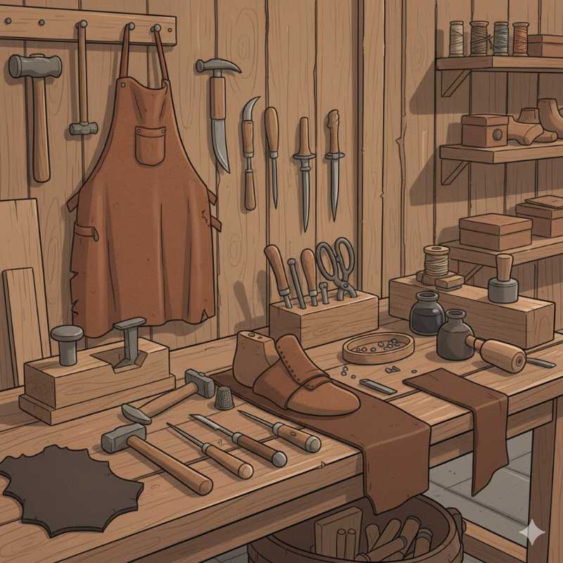 The cordwainer had various tools. A last (a wooden or metal foot form) was used to shape each shoe and awls pierced holes for stitching. Knives, pegging hammers, and other implements cut, shaped and secured the leather. Thread, needles, and wax were needed for making strong seams, and measuring sticks helped to achieve a proper fit.