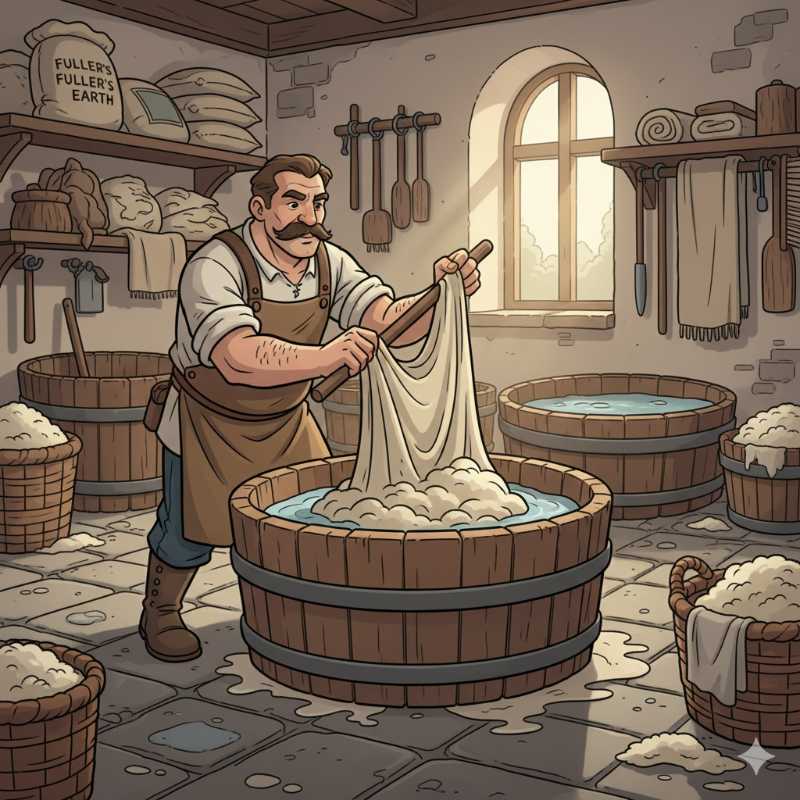 A fuller's job was to clean, thicken, and strengthen woollen cloth after it had been woven. They used treading vats to soak it in fuller's earth (a naturally occurring clay) or stale urine. These helped remove grease and impurities. It was then pounded, trodden or pressed to mat the fibres together. This tightened the weave, making the fabric thicker, warmer and more durable.