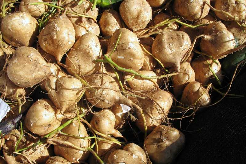 The jicama is a crunchy root vegetable native to Mexico and Central America, sometimes called a "Mexican turnip" because of its round shape. However, jicamas actually belong to the pea family. The part that people eat is the tuber, with the rest of the plant, including the seeds and leaves, being poisonous, similar to how parts of the potato plant are not safe to eat.