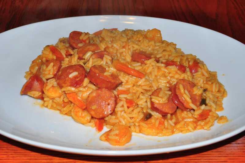 Jambalaya is a Louisiana dish that reflects a mix of French, Spanish, and African influences. Common proteins include chicken, sausage (especially andouille), and shrimp. The dish also includes vegetables like onions, bell peppers, and celery, along with spices and rice cooked together in one pot.