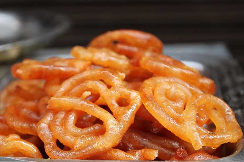 This popular dessert has a crispy exterior and a juicy, syrup-soaked interior, made by piping a fermented batter into hot oil. The fried pieces are then soaked in sugar syrup flavored with ingredients like saffron or cardamom. It is commonly sold by street vendors.