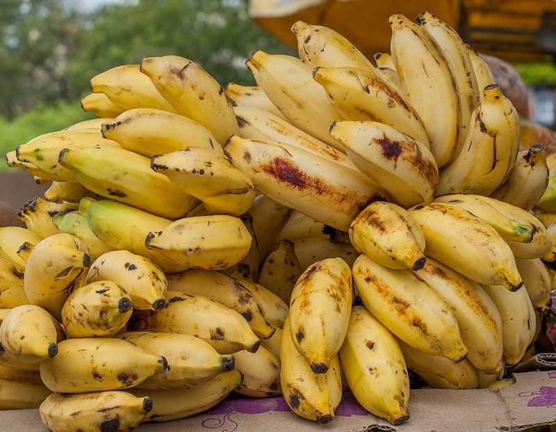 Bananas are picked when green, then allowed to ripen (either naturally or by using ethylene gas) when at the point of distribution. As they ripen they become sweeter, and the skin first turns yellow, then develops brown spots. Once ripe, they only last a few days before starting to deteriorate. The white flesh browns on exposure to air, so bananas are best sliced and added to the fruit salad just before serving. If they need to be sliced in advance, browning can be reduced by application of an acid such as lemon juice - but that extra acidity needs to be considered when combining ingredients for the salad!