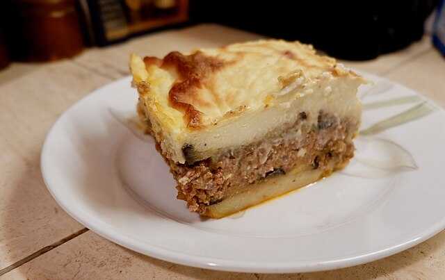 Moussaka is one of the most famous Greek dishes, and consists of vegetables (particularly sliced aubergines) and minced meat (usually lamb) layered together and topped with a savoury egg custard or béchamel sauce layer. The modern version that we know was created by Greek chef and food writer Nikolaos Tselementes in the 1920s; he introduced béchamel sauce to Greece.