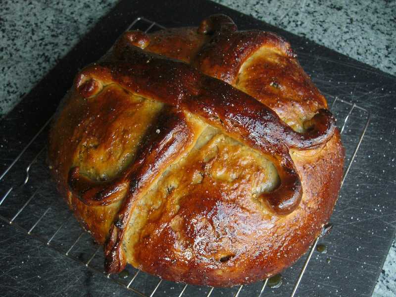 Tsoureki is a type of sweet bread. This version, known as christopsomo, has been made for Christmas - note the cross on top - while another version called lampropsomo is eaten at Easter. It is flavoured with lemon and orange zest, mastic resin or a type of spice called mahleb, which is made from ground Mahleb cherry seed kernels and has a taste similar to almonds. Lampropsomo is made in a braided pattern and has dyed hard-boiled eggs pressed into its dough.