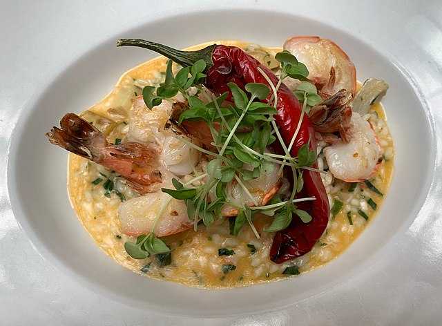 Risotto is an Italian dish traditionally served as a starter, but it can also be served as a main meal, such as this shrimp risotto, or risotto alla milanese with ossobuco. Arborio rice is the main variety used, with the grains being shorter and thicker than other types of rice, and it gives the risotto a creamy texture.