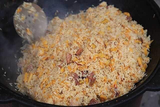 The little orange bits are slices of carrot; onions and garlic may also be used, as well as barberries, marigold or red pepper, depending on the region. Sweet varieties of plov with berries and raisins also exist.